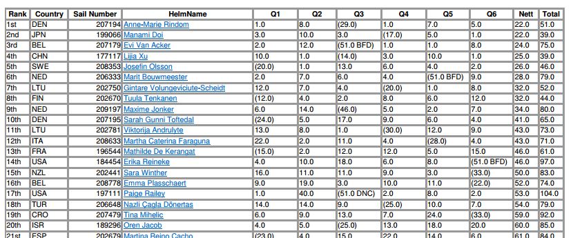 Report Saturday . The initial light wind increased to 15 kn during the 2nd race of the day, and the Worlds continued according to program. Winning the 2nd race of her Group, Anne-Marie Rindom DEN remained on top of the rankings 2 points ahead of the defending champion Marit Bouwmeester NED. Another 2 points back are Tuula Tenkanen FIN and Lijia Xu CHN at equal points on the ranks 3 and 4.