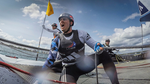 The early lead went to Canfield who always looked stronger at the start, but Martinez found a way past at the top of the beat. With the gusty wind pulsing hard, both boats nosedived badly on the downwind leg, and they regrouped in time to discover they were rapidly converging – collision course – on the same leeward gate mark. Martinez never gave Canfield mark room, forcing US One to ride over the top of the buoy and hooking it up underneath the trampoline.