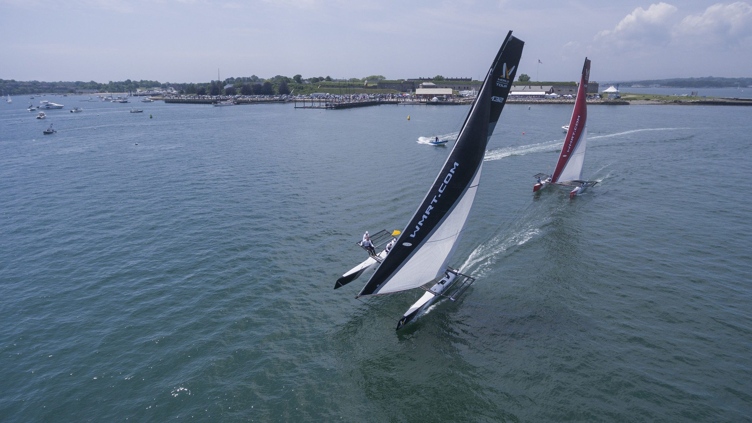 The organisers were able to run the complete schedule of semi-finals and finals. Throughout this the competing teams fought tooth and nail on their nimble hull-flying M32 catamarans, bringing gasps ranging from excitement and euphoria to shock from the crowds assembled round the Fort Adams race course. If there were still any doubts about the new look World Match Racing Tour – the change to catamarans and new courses, etc – today they were fully allayed.