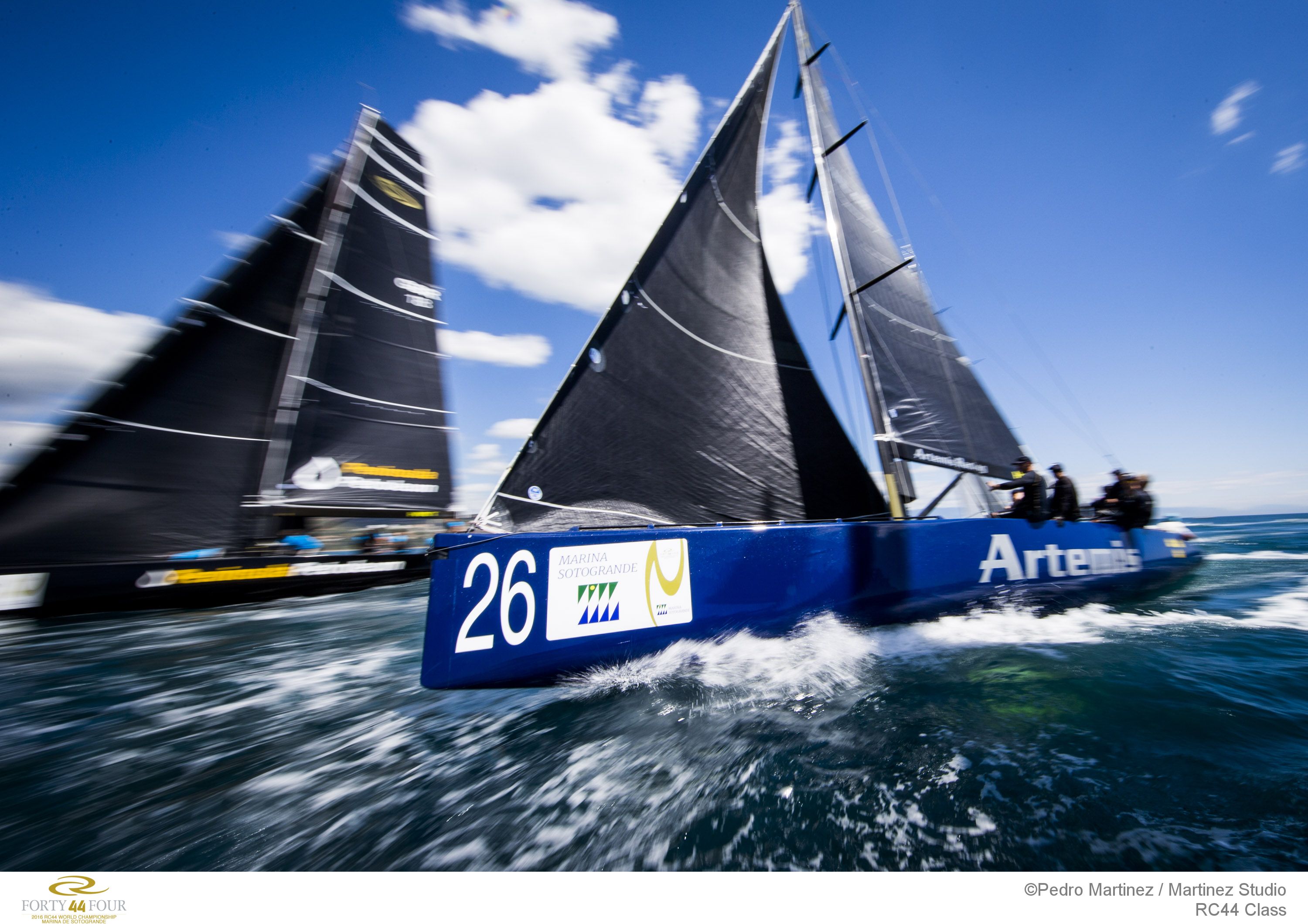 An extra penalty point against Robertson now put the scores to 1-0 in favour of Canfield. Match point to US One, and for a while it looked like the American team were going to take out the next match and win the title. But somehow Robertson found his way past Canfield at the top of the final upwind leg and charged down to the finish, punching the air in defiance. 1-1, and all down to the final match.