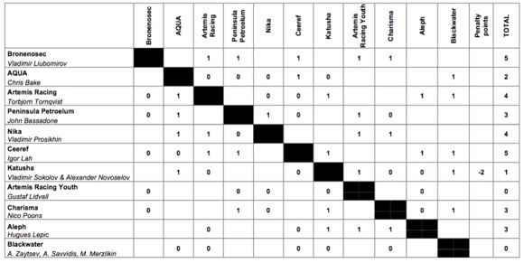 However, the Russian team was not as invincible as their score suggested. As Bronenosec’s Italian tactician, Michele Ivaldi observed: “We had good starts, good crew work, good speed, good driving. In the race against Peninsula Petroleum when we were behind, we kept it close and at the first chance we pounced. Against Artemis we were behind, split gates and after a little fight at the top of the second beat we managed to sneak in front.”